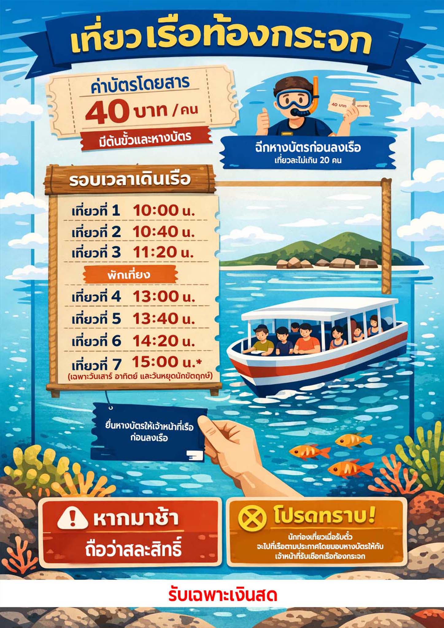 นักท่องเที่ยวสามารถชมปะการัง หลายชนิด หลากสีสัน และฝูงปลาแบบใกล้ชิด ด้วยการดำน้ำแบบผิวน้ำ (snorkel diving) เพลิดเพลินไปกับระบบนิเวศน์ใต้ทะเลอันสวยงาม